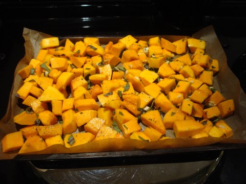 Make the filling. Peel, deseed and chop the squash into chunks. In a large bowl, toss the chunks with the oil, sage and a little salt and pepper and tip the whole lot onto a shallow baking tray lined with baking paper to avoid the squash sticking. Bake at 200 degrees C until the squash is cooked through and is become deliciously slightly charred and toasty round the edges. Don’t take it too far – you are looking to intensify the squash flavour, not burn it.