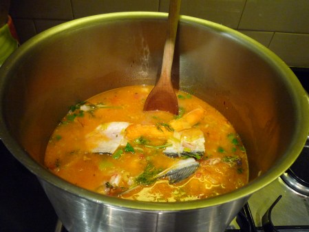 Making this recipe in the dark period (in food distribution terms) between Christmas and New Year all that was available at my local fishmonger was sea bass and sea bream bones heads and trimmings. Despite the lack of variety of fish, the soup was nevertheless suitably flavoursome – it need not be an enormous production and can be varied according to what you have. It’s probably best to avoid oily fish such as salmon and mackerel though as these won’t give the right flavour to the soup.