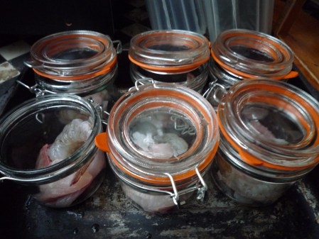 These ingredients will fill 8 small (12 oz) kilner jars and leave you with plenty of fish soup left over which sets to a gelatinous firmness and freezes well.