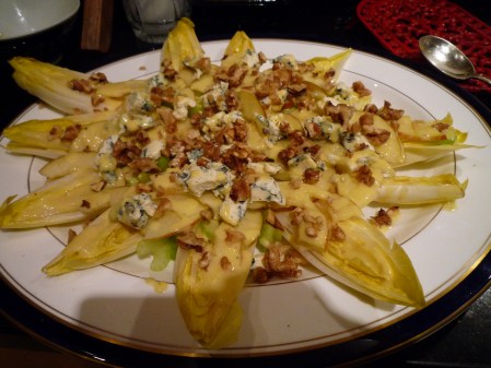 We continued our tour clockwise with the next stage ending in the Aveyron département of Southern France, home to the limestone caves where Roquefort cheese is matured. Our next course was a crunchy salade d’endive, noix et roquefort prepared by Shelley using a Raymond Blanc recipe: