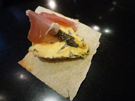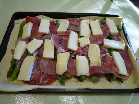 Spread the shallots over the pastry within the rim. Arrange the asparagus on top, then tear the ham into strips and scatter over the asparagus mixture. Cut the cheese into fine slices (the original recipe suggests cutting off the rind but I think this is unnecessary and wasteful). Dot over the filling.