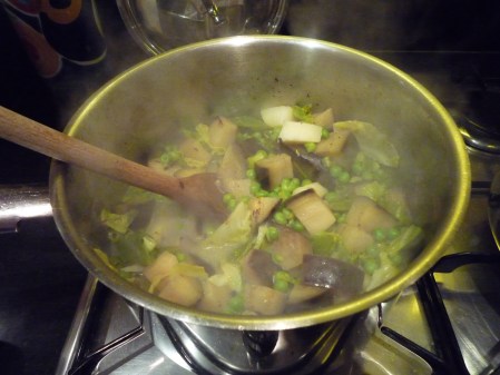 This sabzi recipe (the spellings sabji/sabzi transliterated from the Bengali language seem to be interchangeable) is essentially, a selection of diced vegetables (potato, cabbage, aubergine, peas, beans and so on) boiled in water and milk, flavoured with strong spices like chilli, cumin and aniseed. I’m not going to write out the recipe in full as, in all honesty, I won’t be making it again. It tasted rather less than the sum of its parts and the vegetables were soggy to boot. Ivonne and Edwin were right about this, but at least my sabji had the virtue of being piping hot.