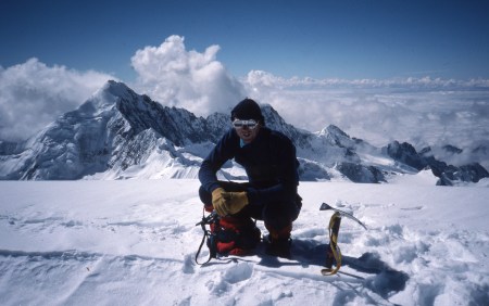 Here’s one of the team again (maybe Alex whom I’ve not yet mentioned?), not SALMON FISHING IN THE YEMEN but using his RUNNING TIME to stride purposefully towards a herd of a llamas in a high Andean glaciated valley. The objective was the ascent of Ancohuma, at 6,427m Bolivia’s third highest peak located in the Cordillera Real range of the Bolivian Andes.