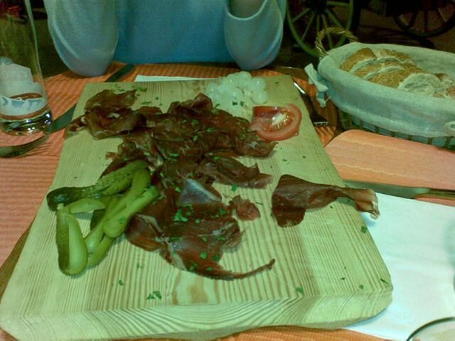 Bruschetta with Gorgonzola dolce, walnuts and slices of fresh pear (painstakingly dipped in lemon juice to stop them going brown)