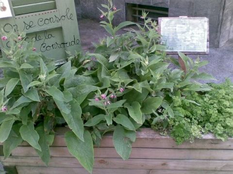 A photo of the planter containing comfrey (Symphytum officinale or consoude in French) appears at the bottom of the post.